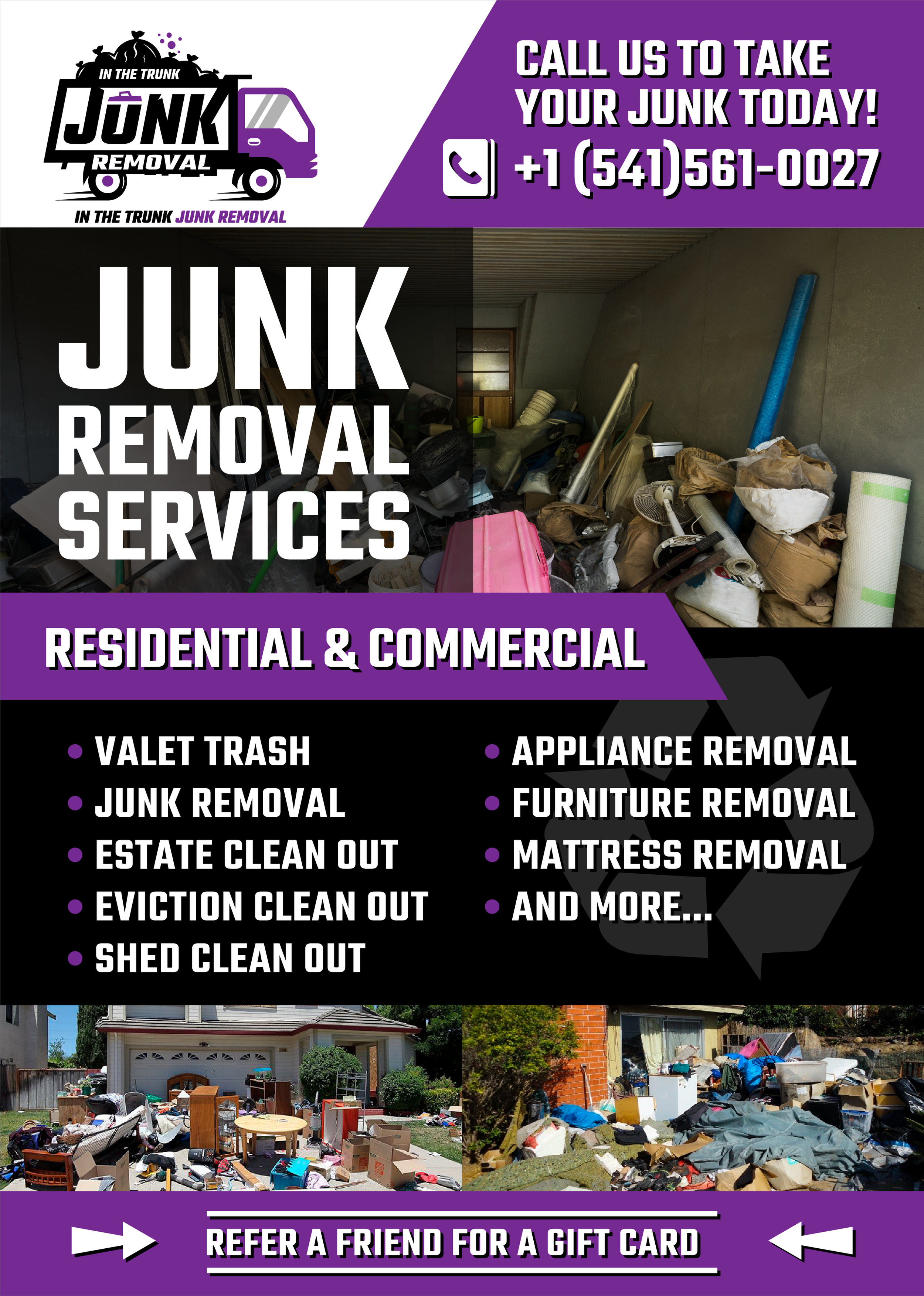 Tired of clutter? We make it disappear. From single-item pickups to full-property clean outs, In The Trunk Junk Removal handles hauling, recycling, and dump runs quickly and professionally.